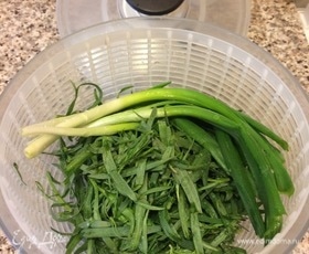 Зелень вымыть и дать воде стечь. Если у тархуна стебель жесткий, то надо будет снять с него листики. Я купила 3 пучка тархуна, убрала стебли и в рецепте указала чистый вес. Вы можете добавить больше тархуна, но будьте осторожны, так как тархун имеет очень терпкий вкус и может перебить вкус теста, яиц и т. д.