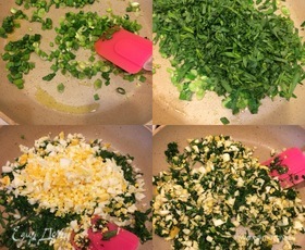 Итак, зелень нарезать. В сковороде с толстым дном разогреть оливковое масло, добавить лук и слегка потушить. Потом добавить тархун, перемешать и тушить еще одну минуту. Затем вареные яйца нарезать и добавить к зелени, посолить, поперчить, перемешать и снять с огня.