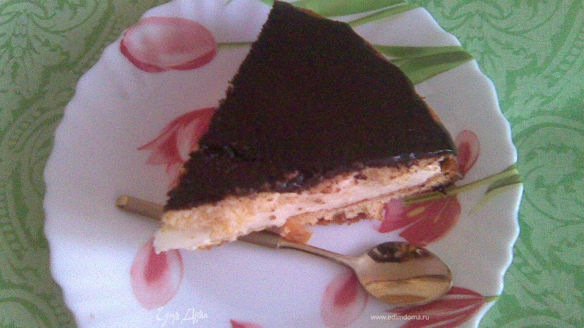 Суфле: Желатин залить молоком отставить на 15 мин Масло растереть с сахаром ,взбивать на медленных оборотах.Постепенно добавляя молочно- желатиновую смесь. Отдельно взбить белки с сахаром Соединить обе жидкости медленно взбивая до густого крема. Корж разрезать на 2 части, промазать джемом.Сверху выложить суфле,накрыть вторым коржом. Шоколад растопить на водяной бане, залить торт. Поставить в холодильник на час.