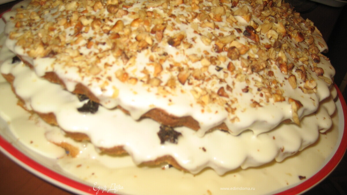 - Шаг 3Смазываем корж кремом, можно добавлять чернослив/абрикосы/орехи.