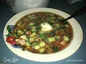 В ингредиентах нет клецек, поэтому я их там не указал. Беру две горсти картофельных клецек и кладу в кипящий бульон. - Шаг 4