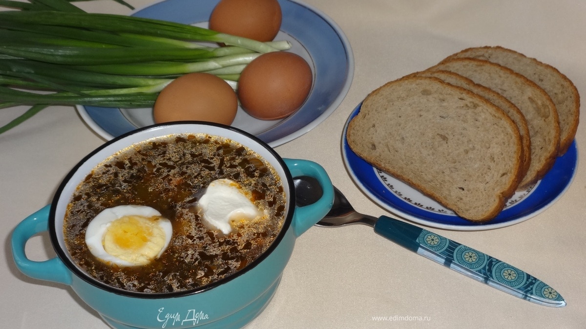 Разлить зеленый борщ по тарелкам, положить по кусочку яйца, сметану. Подавать с зеленым луком. - Шаг 13