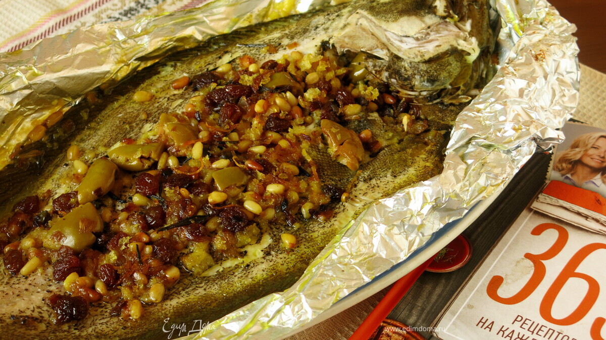 Камбала, запеченная с кедровыми орешками и изюмом