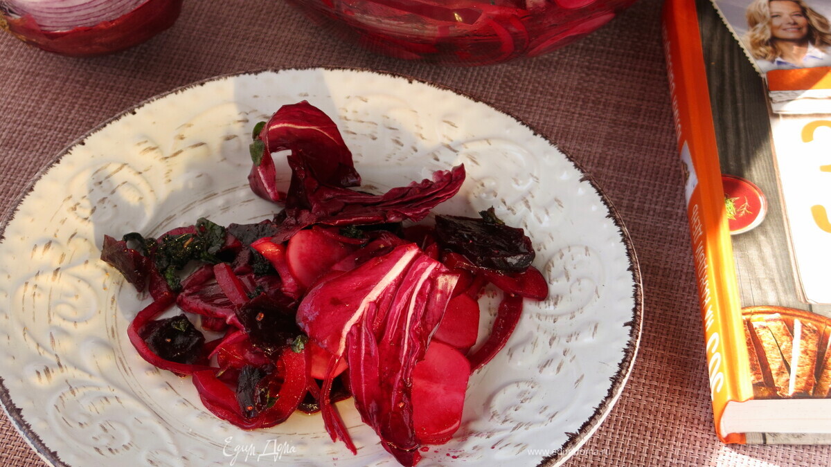 Фишка салата — заправка из сока свеклы и компоненты розового цвета. Рецепт нашла в книге «365 рецептов на каждый день». Уменьшила количество радиккио, у него слишком выраженная горчинка. И рекомендую чуть промариновать весь салат, подавать не сразу. Приятного аппетита!