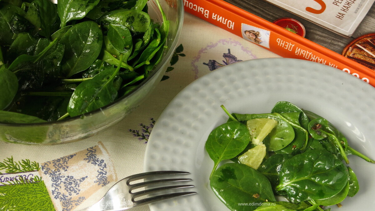 Соединяем лимон со шпинатом, кладем листья мяты, перемешиваем, поливаем маслом, солим, перчим. - Шаг 6