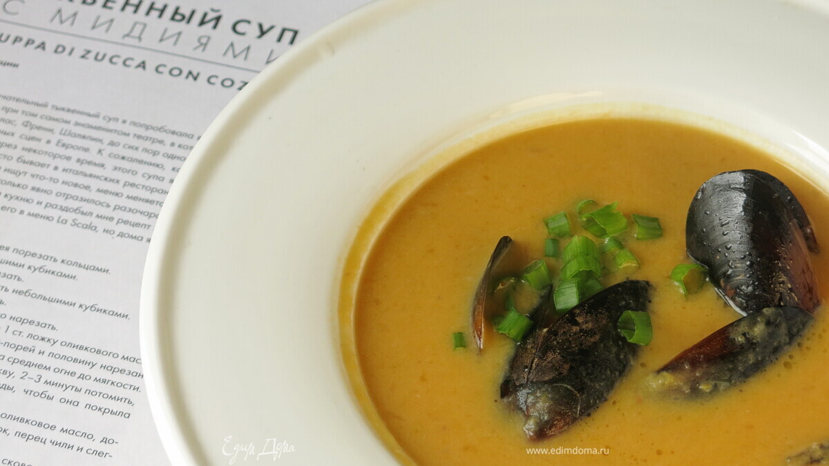 Тыквенный суп с мидиями (zuppa di zucca con coze) — рецепт из книги Юлии Высоцкой «В поисках тирамису». Суп, приготовленный по этому рецепту подавался в ресторане La Scala. Я внесла изменение, заменила сливки на кокосовые сливки, сливочное масло на растительное. Приятного аппетита!