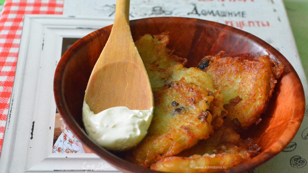 Разогрейте масло и ложкой выкладывайте картофельную массу. Обжаривайте с 2-х сторон. Подавать со сметаной.