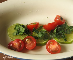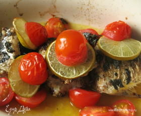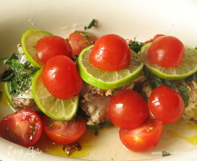 Воодушевленная рецептами запеченной рыбы от Ю. Высоцкой, придумала рецепт кефали, запеченной с мятой, лаймом и томатами. Рыбка сочная, с приятной кислинкой. Приятного аппетита!