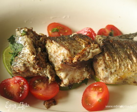 Натираем смесью кусочки рыбы (сверху и внутри).