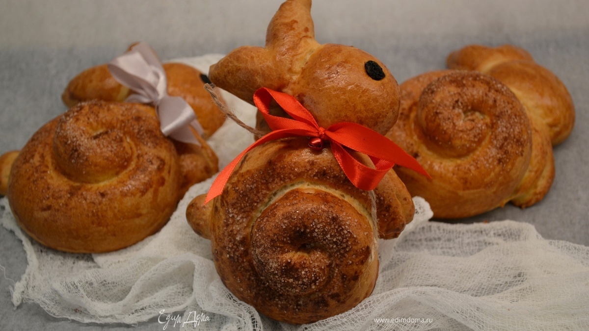 Смазываем яйцом, «тельце» посыпаем сахаром с корицей. Делаем из изюма глазки. Выпекаем около 30 минут при 170°C. - Шаг 7