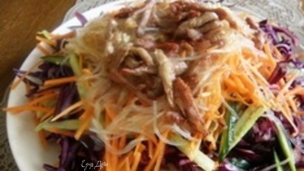 - Шаг 1Капусту мелко нашинковать. Огурец помыть и нарезать длинной тонкой соломкой. Морковь помыть, почистить, натереть на крупной корейской тёрке или нарезать тонкой длинной соломкой. Лапшу залить кипятком, через пять минут откинуть на дуршлаг. На широкое блюдо выкладываем слоями 1/2 часть капусты, огурцов, моркови и лапши, поливаем 1 ст. л. винного уксуса, 1 ст. л. подсолнечного масла, 1 ст. л. соевого соуса, 1 ч. л. кунжутного масла. Посыпаем щепоткой соли и приправы «Маласянь». Через чеснокодавилку выдавливаем 1/2 части чеснока. Затем повторяем все слои и добавляем приправы: 2 ст. л. винного уксуса, 2 ст. л. подсолнечного масла, 2 ст. л. соевого соуса, 2 ч. л. кунжутного масла. Посыпаем 2 щепотками соли и приправы «Маласянь». Также выложить жгучий красный перец, если Вы его используете. Свинину нарезать длинными тонкими полосками и обжарить на растительном масле до золотистого цвета, посолить. Выложить мясо горкой на салат. Салат перемешать уже на столе. Если Вам не хватает приправ, то, безусловно, можно приправить по вкусу.