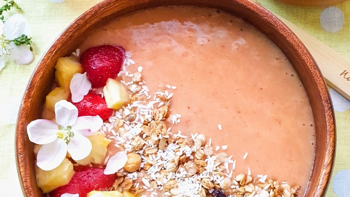 - Шаг 1Клубнику и ананас предварительно нарезать на кусочки и заморозить (можно и свежие взять). Положить в блендер фрукты, залить апельсиновым фрешем.