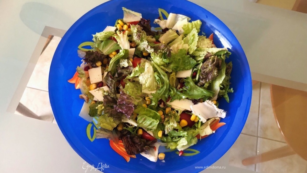 Салат с козьим сыром, гранатом, кукурузой и помидорами