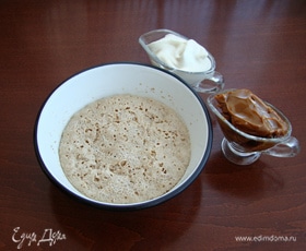 Как только дрожжи поднимутся шапочкой, добавить сметану и вареную сгущенку комнатной температуры. Перемешать.