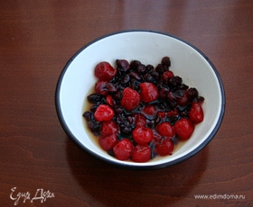Пока подходит наше тесто, подготовим клюкву и вишню. Для этого ягоды залить кипятком, воду слить и залить 3 ст. л. коньяка.