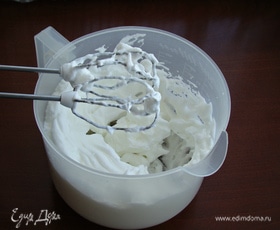 Белки взбить со щепоткой соли в пышную устойчивую пену.