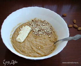 К массе добавить измельченный миндаль и сливочное масло комнатной температуры. Все перемешать.