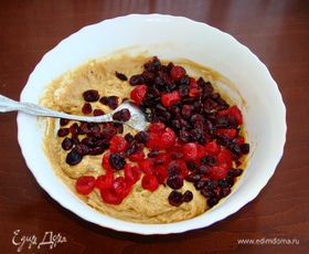 Ягоды отжать, обсушить бумажным полотенцем и добавить к подошедшему тесту. Все перемешать. Тесто будет вязким и липким, так и должно быть. Поэтому перемешивать лучше ложкой.