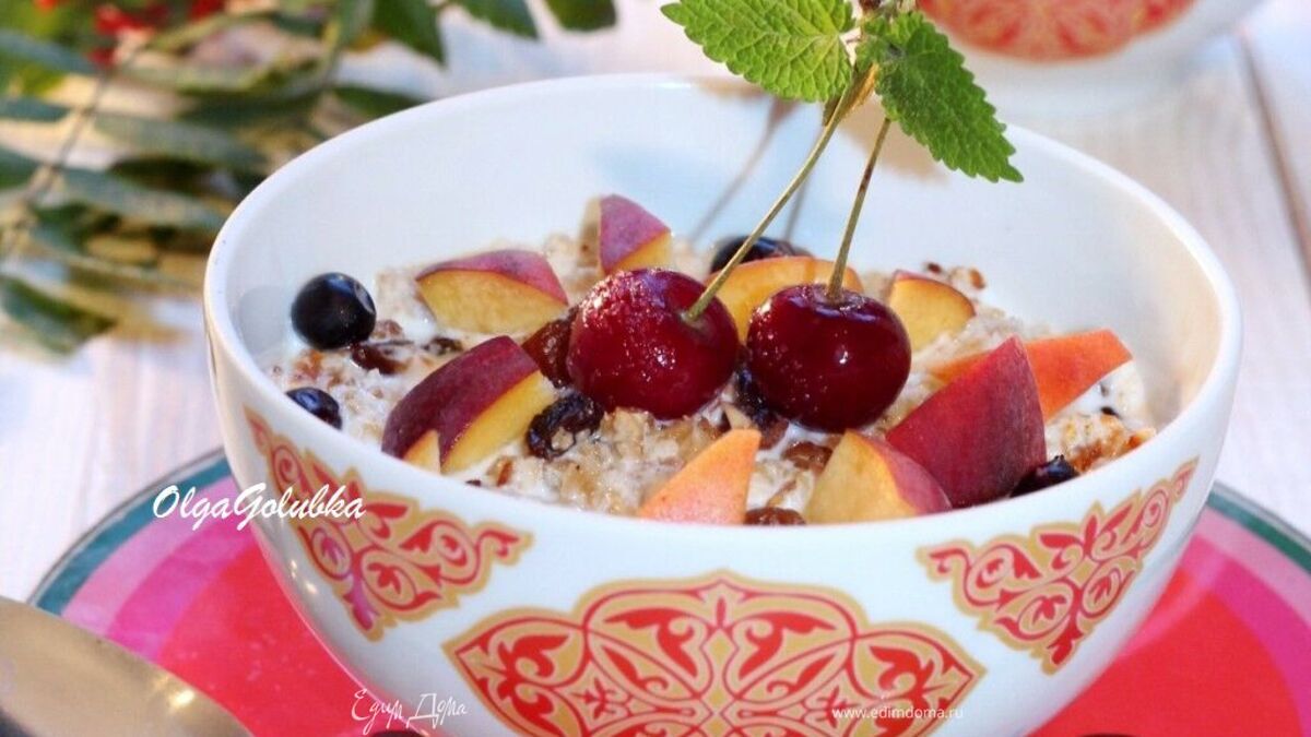 Затем добавляем молоко, кусочки фруктов, ягоды и подаем к столу! Очень вкусно и полезно!