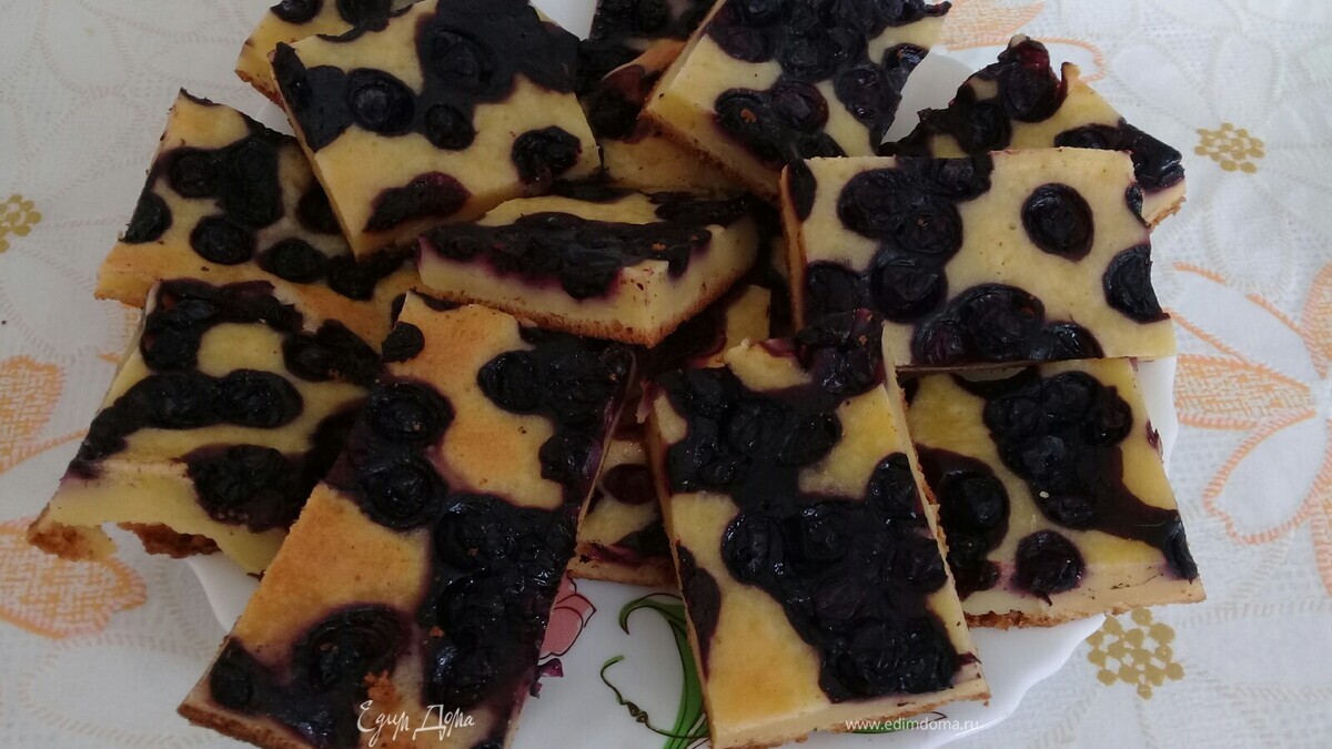 Добавить полстакана свежей или замороженной голубики. Кстати, подойдет и такая лесная ягода, как черника. Выложить бисквитное тесто с голубикой на смазанный растительным маслом противень. Запечь в духовке при 180°C 40 минут.