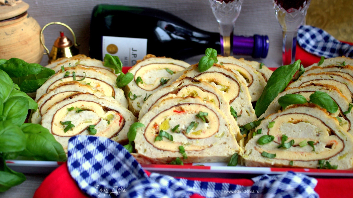 Остудить немного, если нужно, рулет подать теплым. Нарезать.