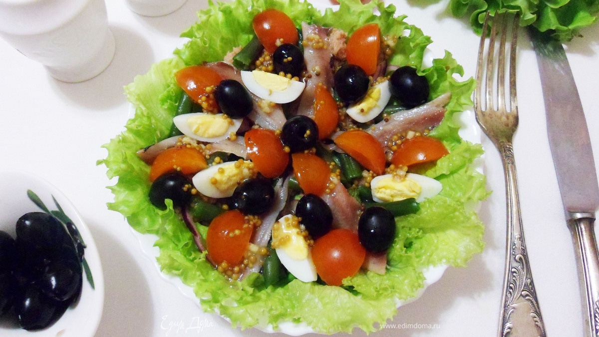 Салат «Нисуаз» — традиционное блюдо французской кухни. Сегодня его можно встретить в меню любого ресторана. А сколько ресторанов — столько и вариантов салата. Основа подлинного «Нисуаза» — зеленый салат, лук, оливки, помидоры и анчоусы. Тунец и вареные яйца необязательны, но с ними намного вкуснее. Зеленая фасоль придаст салату сытность. А изюминка кроется в заправке из смеси оливкового масла и зернистой горчицы — это сочетание придает салату пикантный вкус.