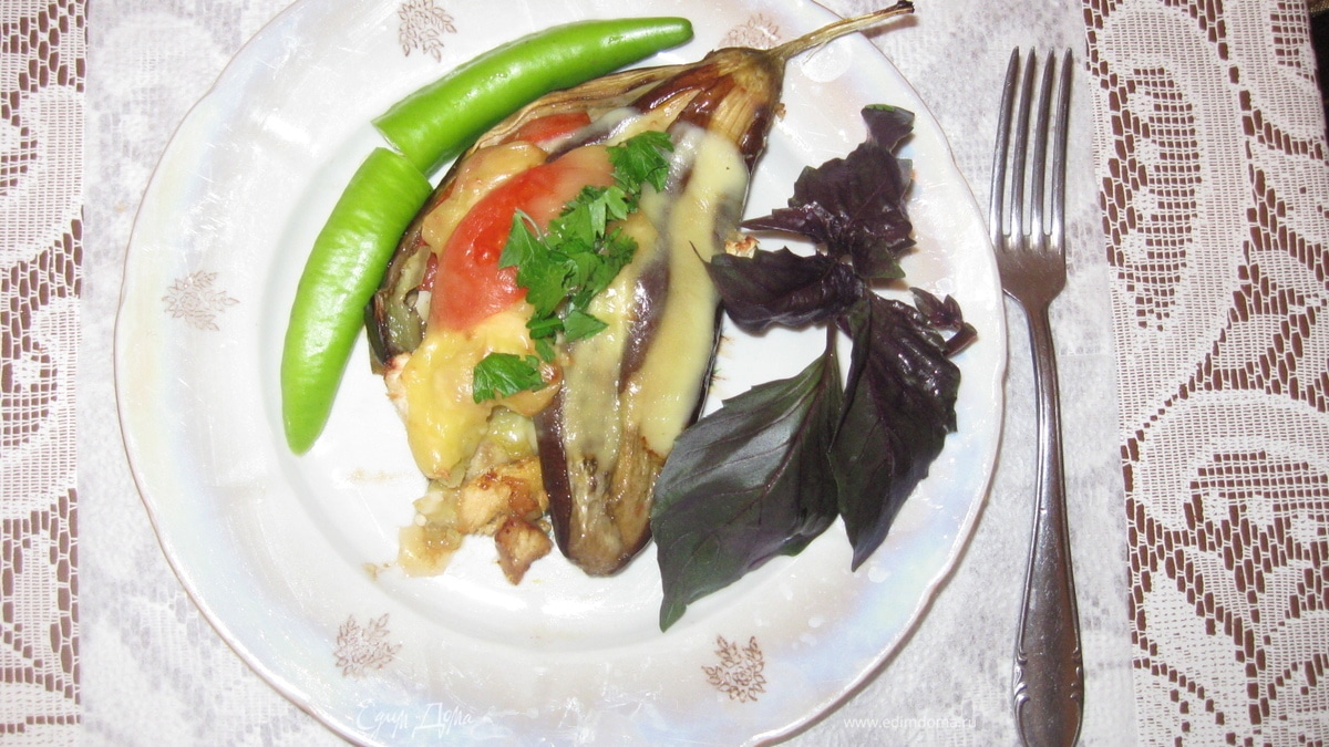 Почистить баклажан полосками, нарезать их вдоль на 3-4 язычка не до конца,примять, чтобы приняли форму веера.Вареную грудку мелко накрошить,так же мелко накрошить перец и чеснок,помидоры нарезать ломтиками,сыр натереть на терке. - Шаг 2