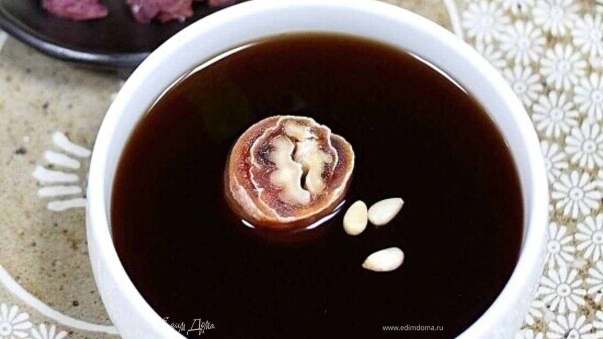 Остудите готовый напиток. Разлейте по чашкам. Нарежьте сушеную хурму на половинки и положите одну половинку в чашку с напитком. Добавьте несколько кедровых орешков. Оставьте настаиваться на 60 минут. Либо можно подавать напиток без хурмы и орешков. Храните напиток в холодильнике.
