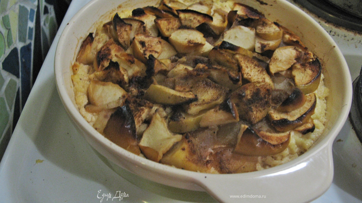 Кладем творог, следующим слоем выкладываем яблоки и груши. Ставим в разогретую до 180°C духовку. Выпекаем 45 минут.