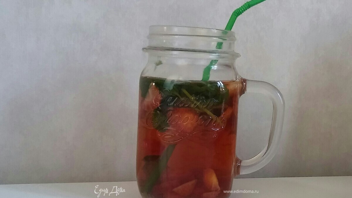 В кружку кладем мяту, нарезанную клубнику и ситечко с чаем. - Шаг 5