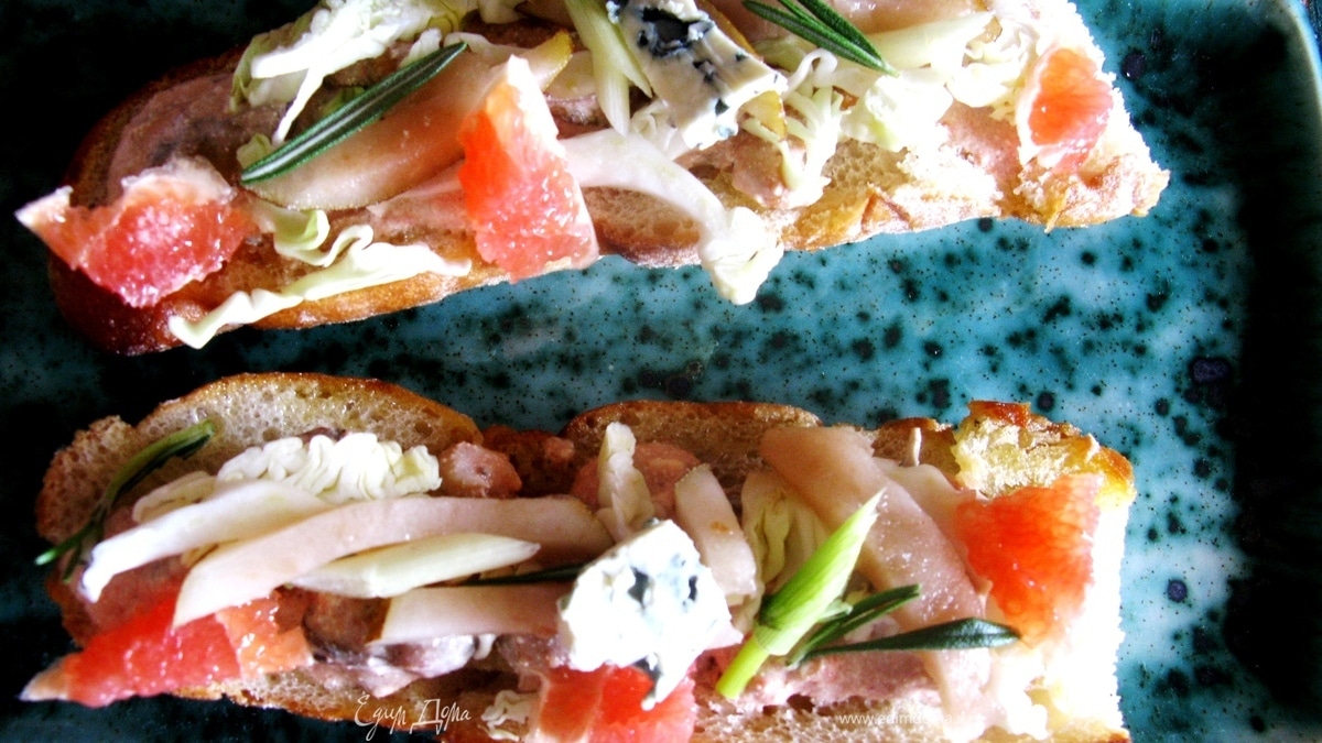 Нарезаем молодую капусту и грушу тонкими полосками, нарезаем лук и приправляем грейпфрутом. Выкладываем розмарин и маленькие кусочки французского сыра с плесенью. - Шаг 5