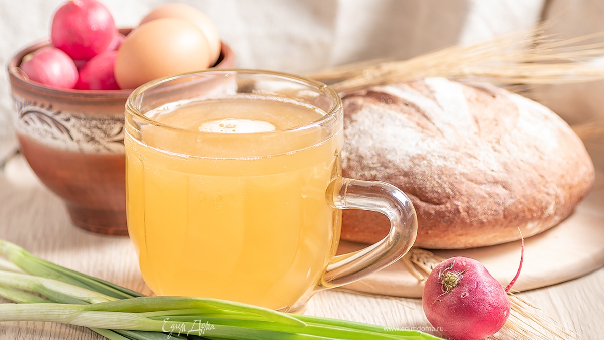 О готовности напитка свидетельствует исчезновение дрожжевого запаха и уверенные пузырьки. Вкус получается в меру кислый, свежий. Он идеален для окрошки и очень бодрит, если пить просто так. На здоровье!