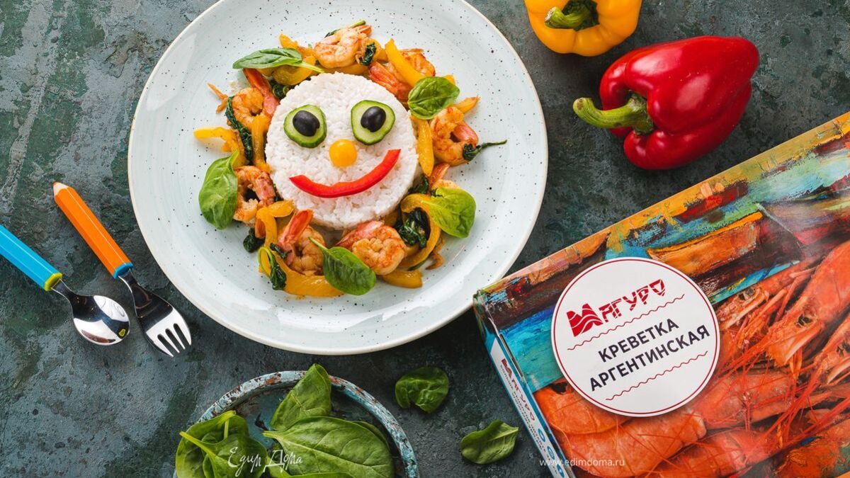 Вокруг риса выложите креветки со шпинатом и перцем. На рисе выложите рожицу с глазками из кружков огурца и маслины, носом из кусочка маслины и ртом из ломтика болгарского перца. Этот веселый обед точно понравится вашему малышу!
