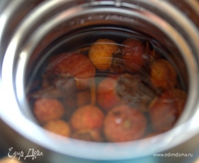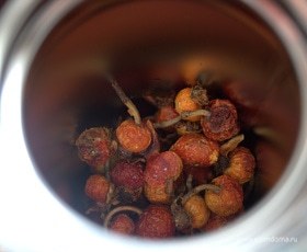 Залить настоявшимся отваром шиповника. Термос я снова залила кипятком и закрыла.