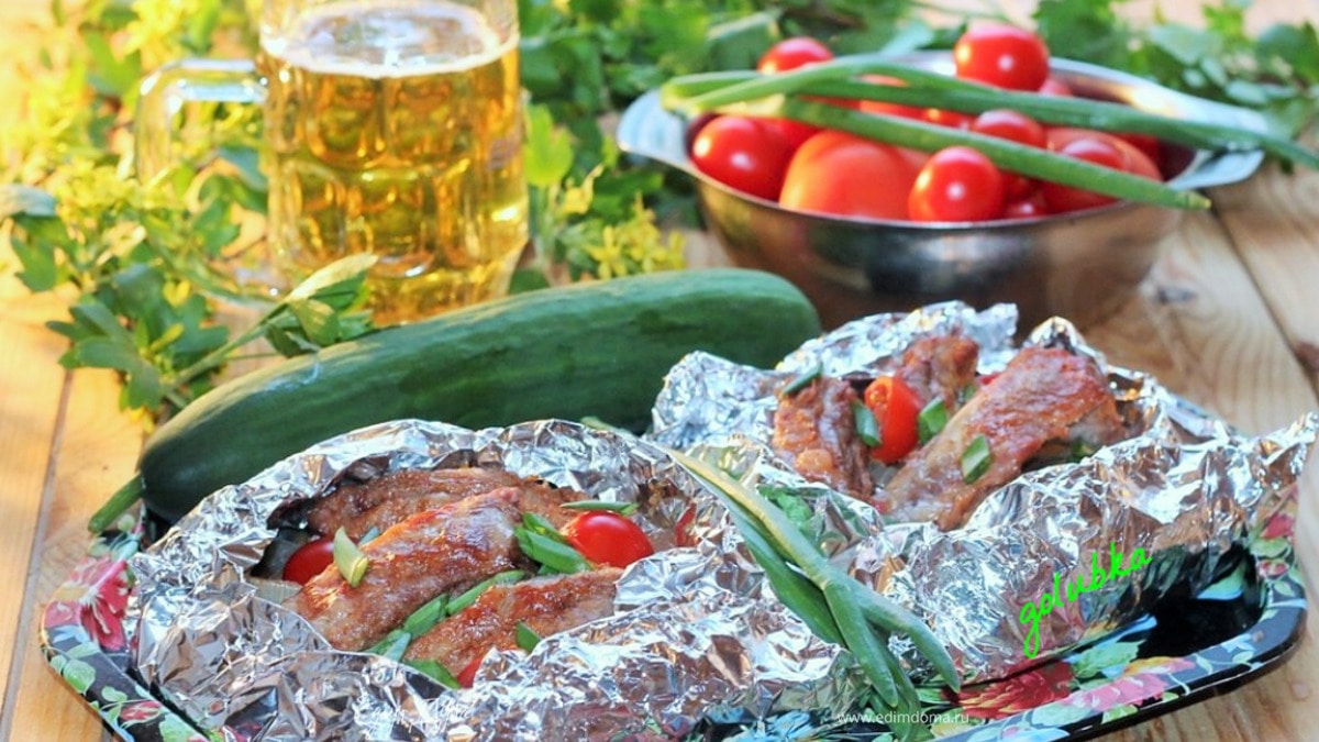 Берем конвертики с собой на пикник и запекаем на гриле. Или запекаем ребрышки в разогретой до 180°C духовке до готовности. - Шаг 9