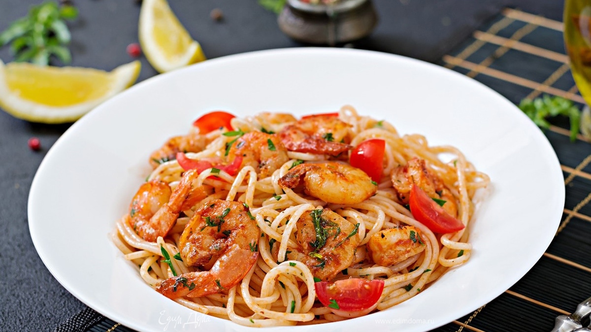Спагетти с креветками в томатном соусе