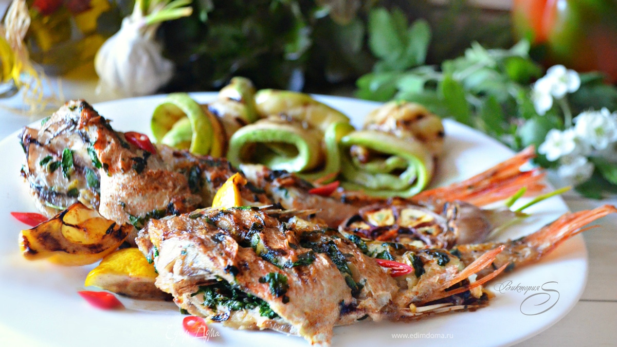 Окунь, запеченный на гриле с травами