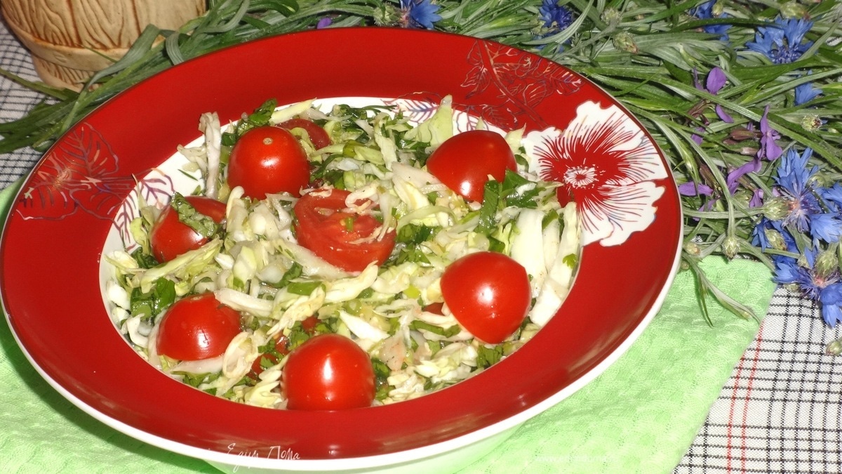 Отличным дополнением к шашлыку на пикнике станет этот овощной салат. Быстрый в приготовлении, вкусный, ароматный и полезный. Дома можно сделать заготовки для салата, нарезав капусту и зелень. А заправить непосредственно на природе. Можно добавлять в салат и другие овощи — редис, огурцы, сладкий перец и т. д. Угощайтесь! Вкусно!