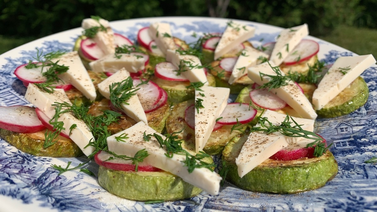 Нарезаю тонкими кружочками редис. Тонкими полосками режу сыр плавленый, нарезаю укроп. Зубчик чеснока тру на терке. Кладу на кабачки чеснок, редис, сыр. - Шаг 3