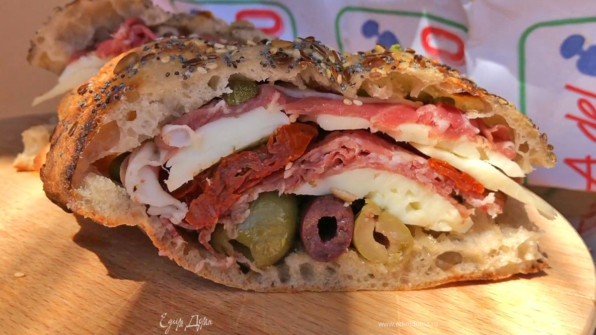 Накрыть бутерброд верхней частью фокаччи и разрезать пополам.
