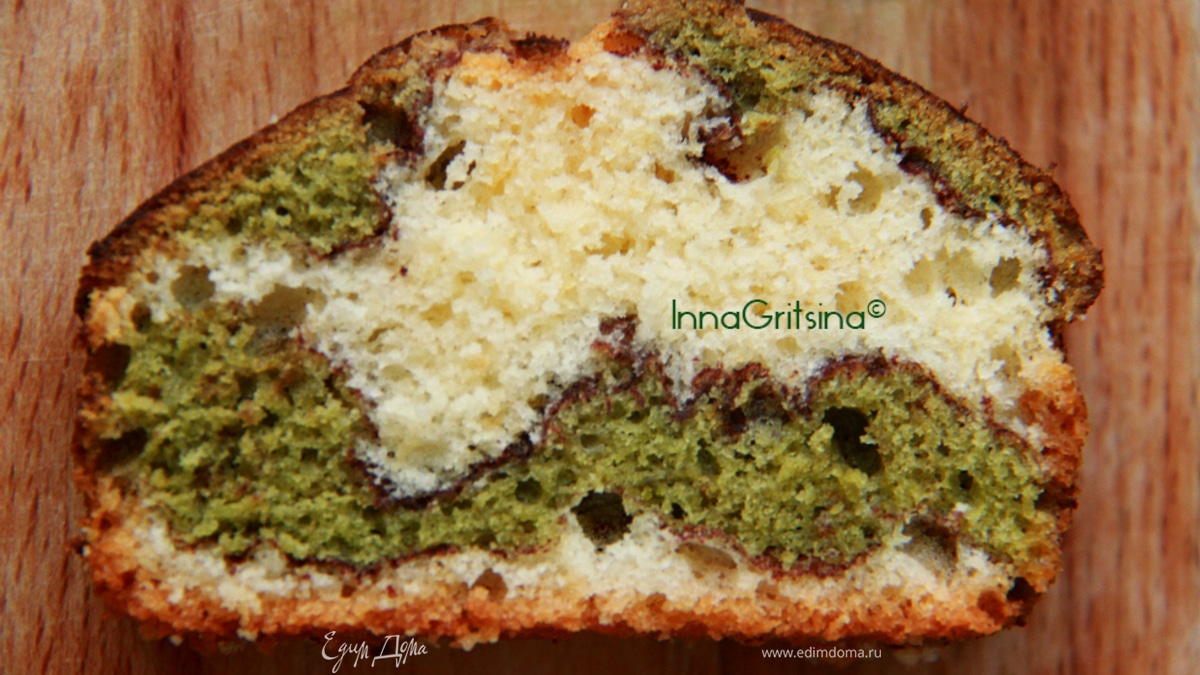 Форму объемом 550 мл смазать маслом (у меня форма из специального картона для выпечки, смазывать не нужно). Выкладывать слоями белое и зеленое тесто, посыпая каждый слой какао-порошком. - Шаг 10
