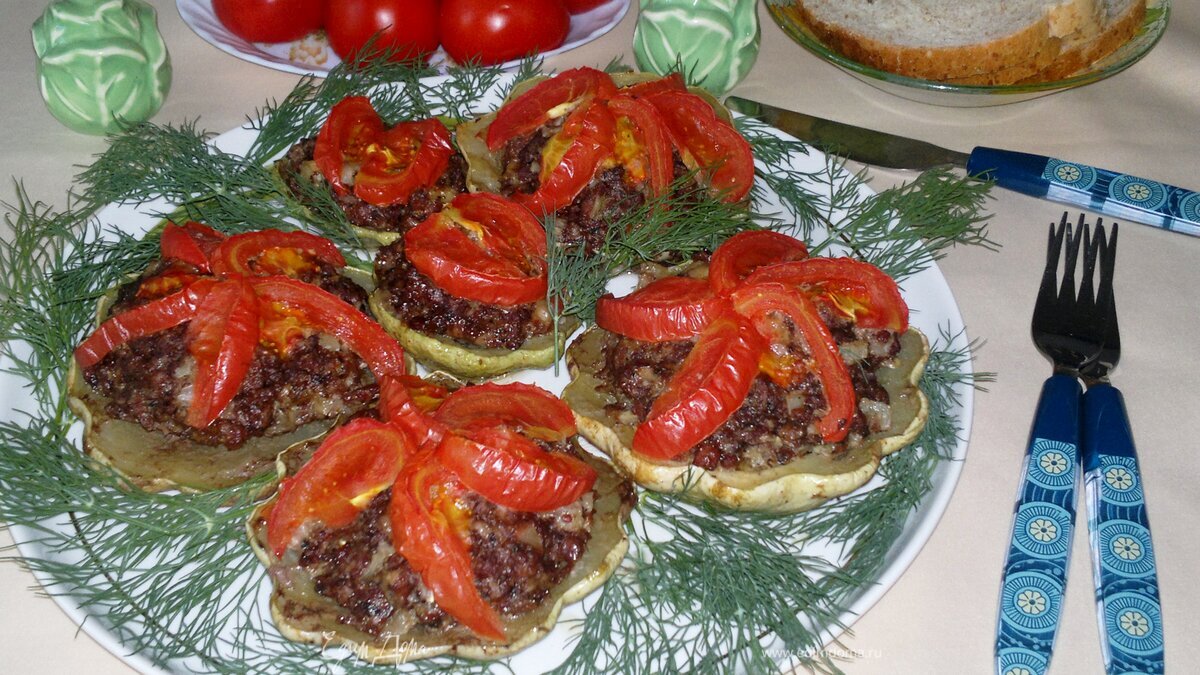 Вкусное блюдо из патиссонов готово! Выложить патиссоны с фаршем и помидорами на блюдо, украсить любой зеленью. Угощайтесь! Приятного аппетита!
