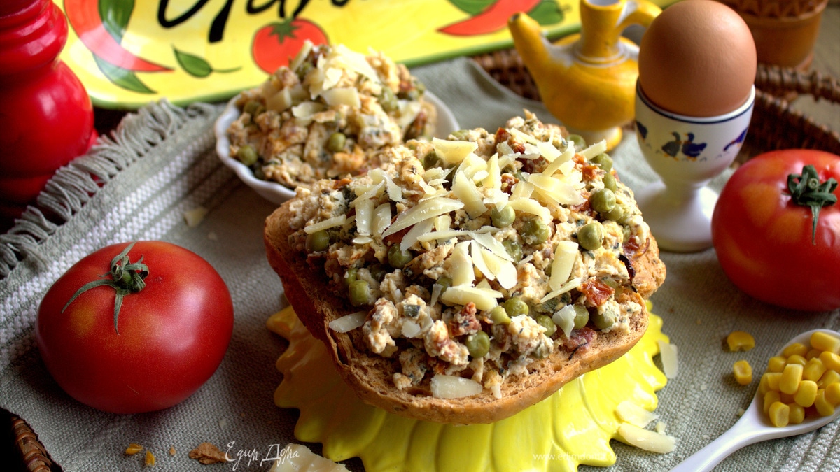 Чтобы не стоять в жару долго у плиты, приготовим моментальный омлет с добавками, которые найдем дома. Любая зелень, овощная заморозка приветствуются. Автор рецепта — Hаталья (Okoolina). У нее омлет со шпинатом, горошком и стручковой фасолью, у меня — с укропом, вялеными томатами и горошком.