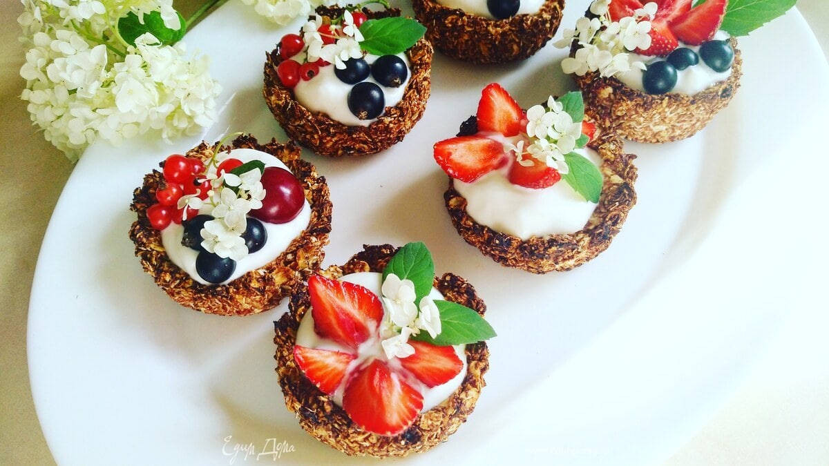 Заполняем корзиночки греческим йогуртом, украшаем сезонными ягодами, можно добавить веточку мяты. Приятного аппетита. Вкусный быстрый завтрак готов!