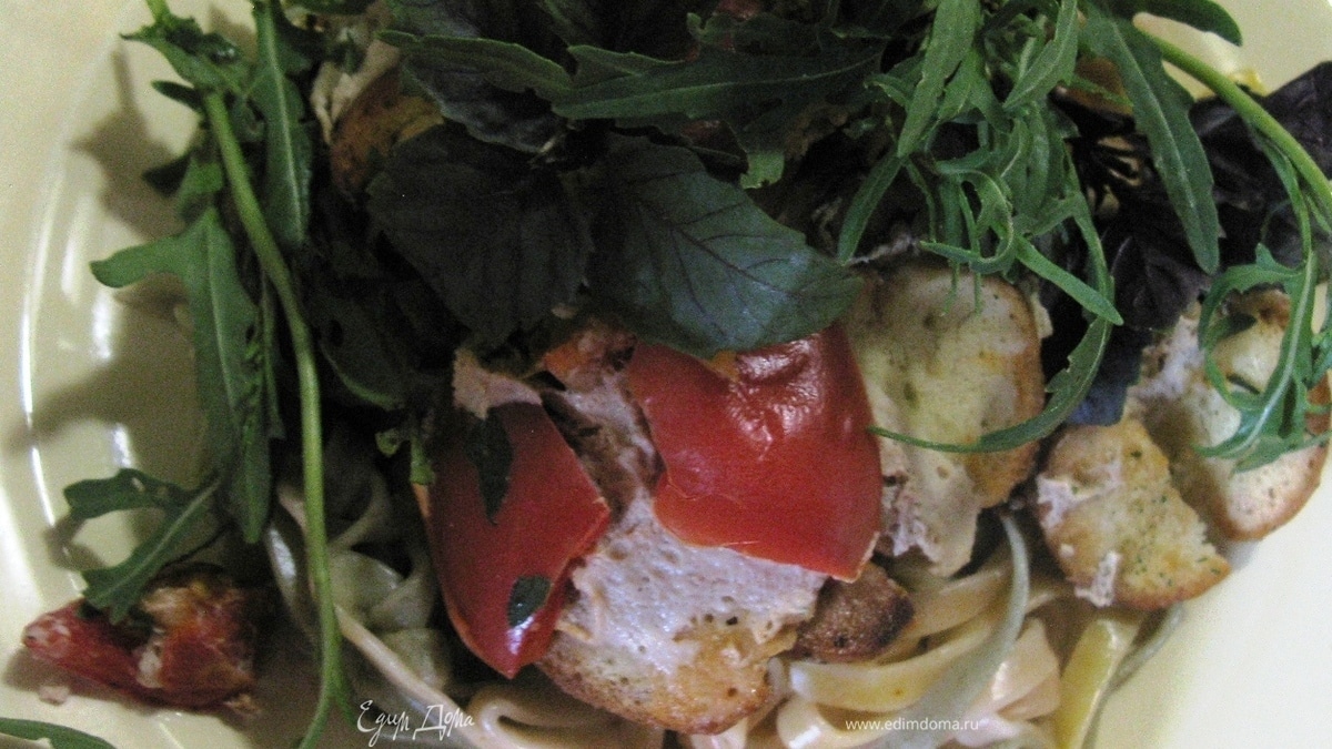 Базилик и рукола отлично дополнят вкус блюда, но можно также добавить шпинат или другую любимую зелень. Багет лучше подавать слегка подсушенным — так он будет лучше сочетаться с блюдом.