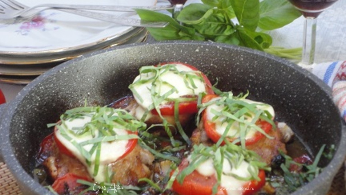 Мало кто не знает, что такое итальянский салат «Капрезе». Эти куриные бедра приготовлены по мотивам этого салата, в котором обязательно присутствуют томаты, моцарелла, базилик и бальзамический уксус. Все это присутствует и здесь, только вместе с обжаренными куриными бедрами. Идея этого блюда взята Викторией Попин из американского блога. За что ей большое спасибо.