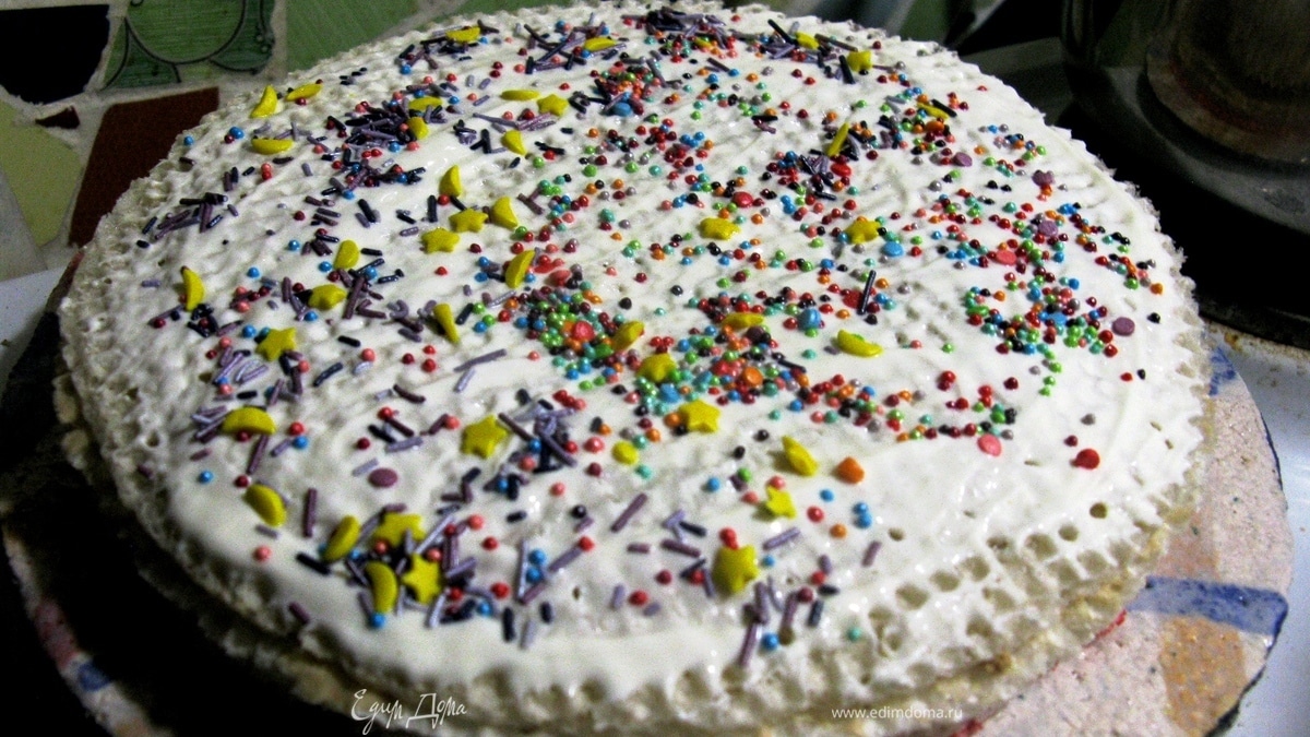 Последний слой покрываем белой несладкой сметаной, посыпаем перламутровой посыпкой. Всем приятного!
