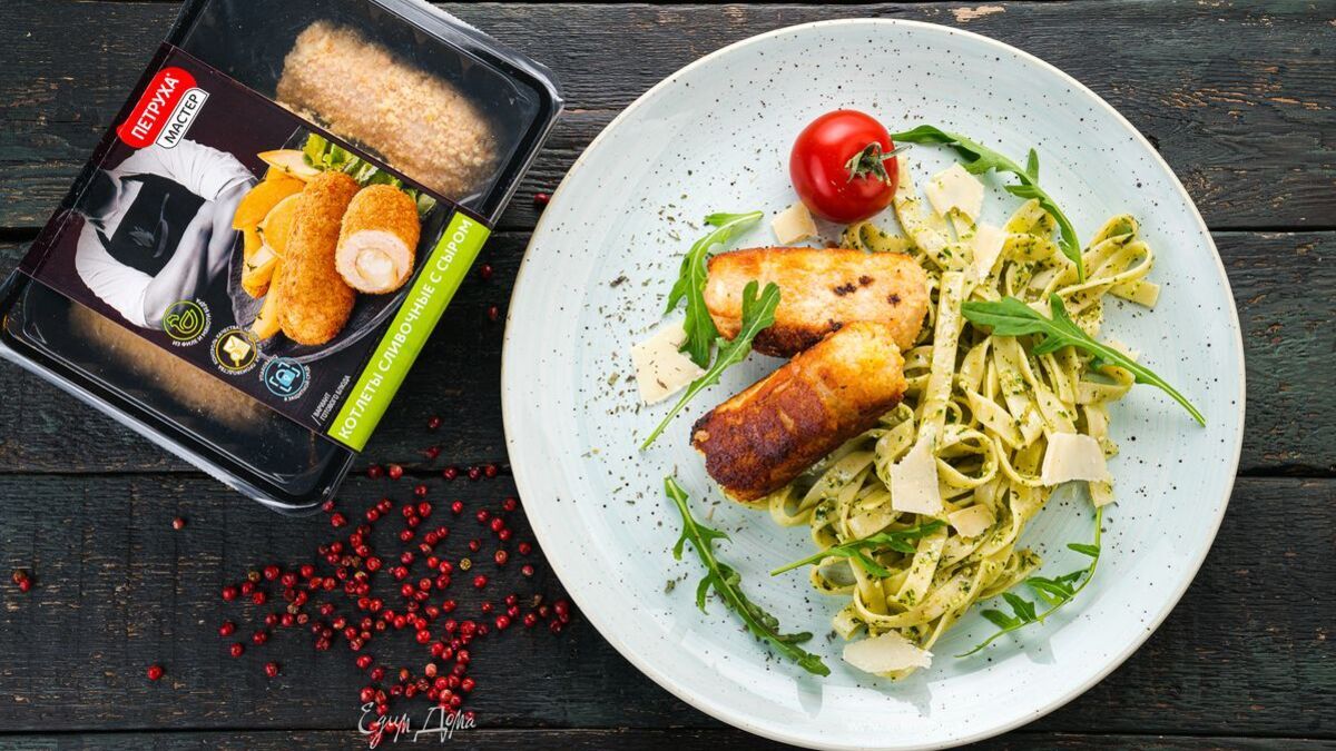 Подавайте котлеты с пастой под соусом песто. Приятного аппетита!