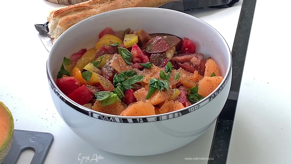 Дыню разрезать пополам, удалить семечки. С помощью ложки вынуть мякотьи добавить в салат. - Шаг 3