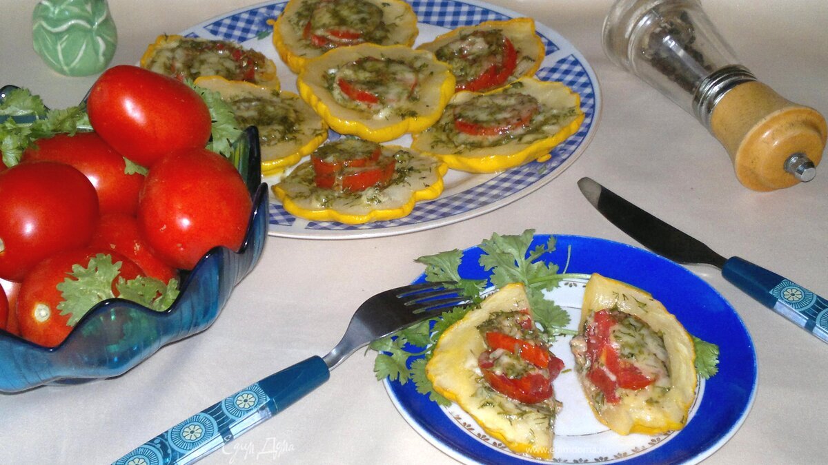 Подать патиссоны с помидорами и сыром к столу. Угощайтесь! Приятного аппетита!